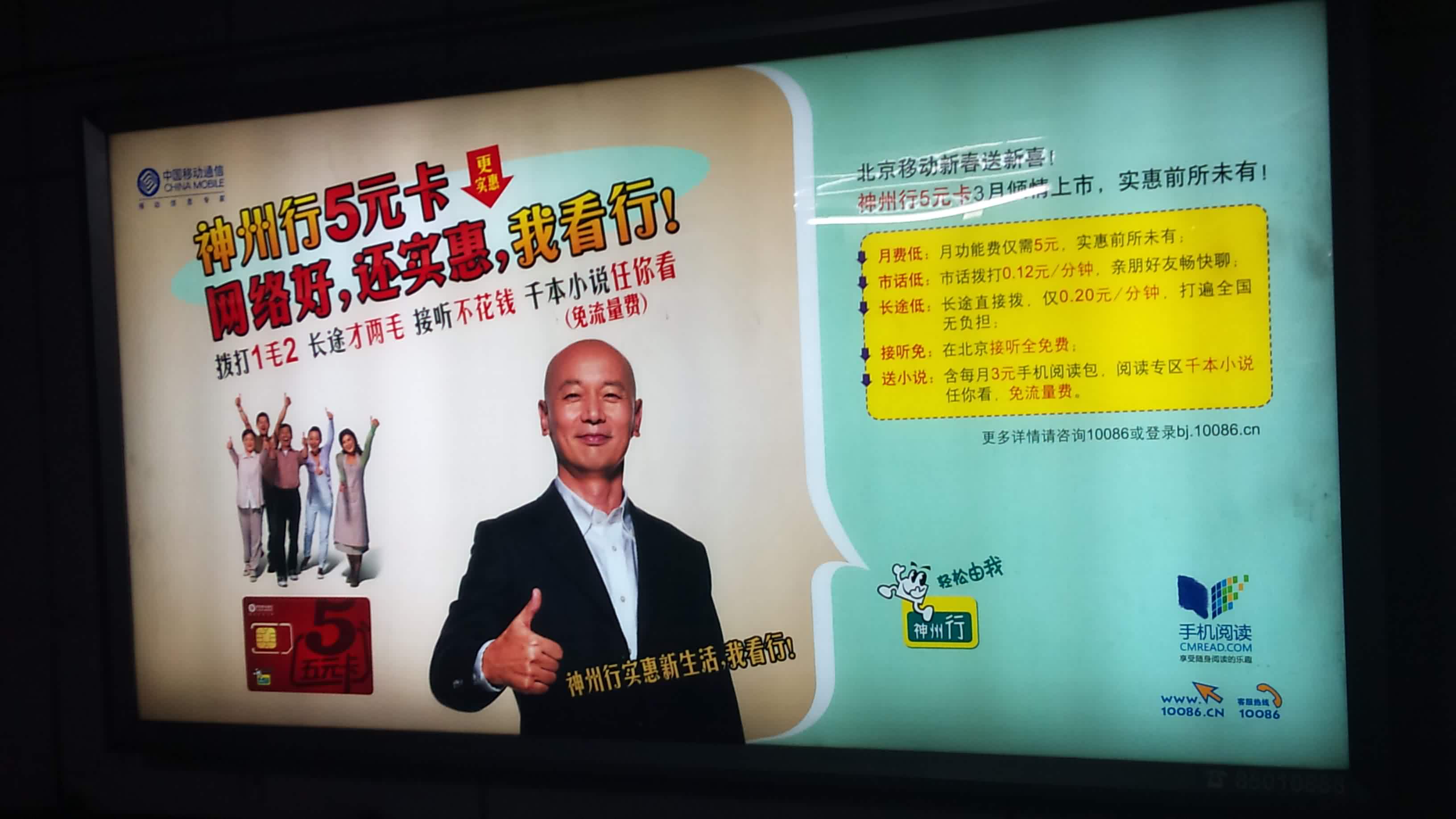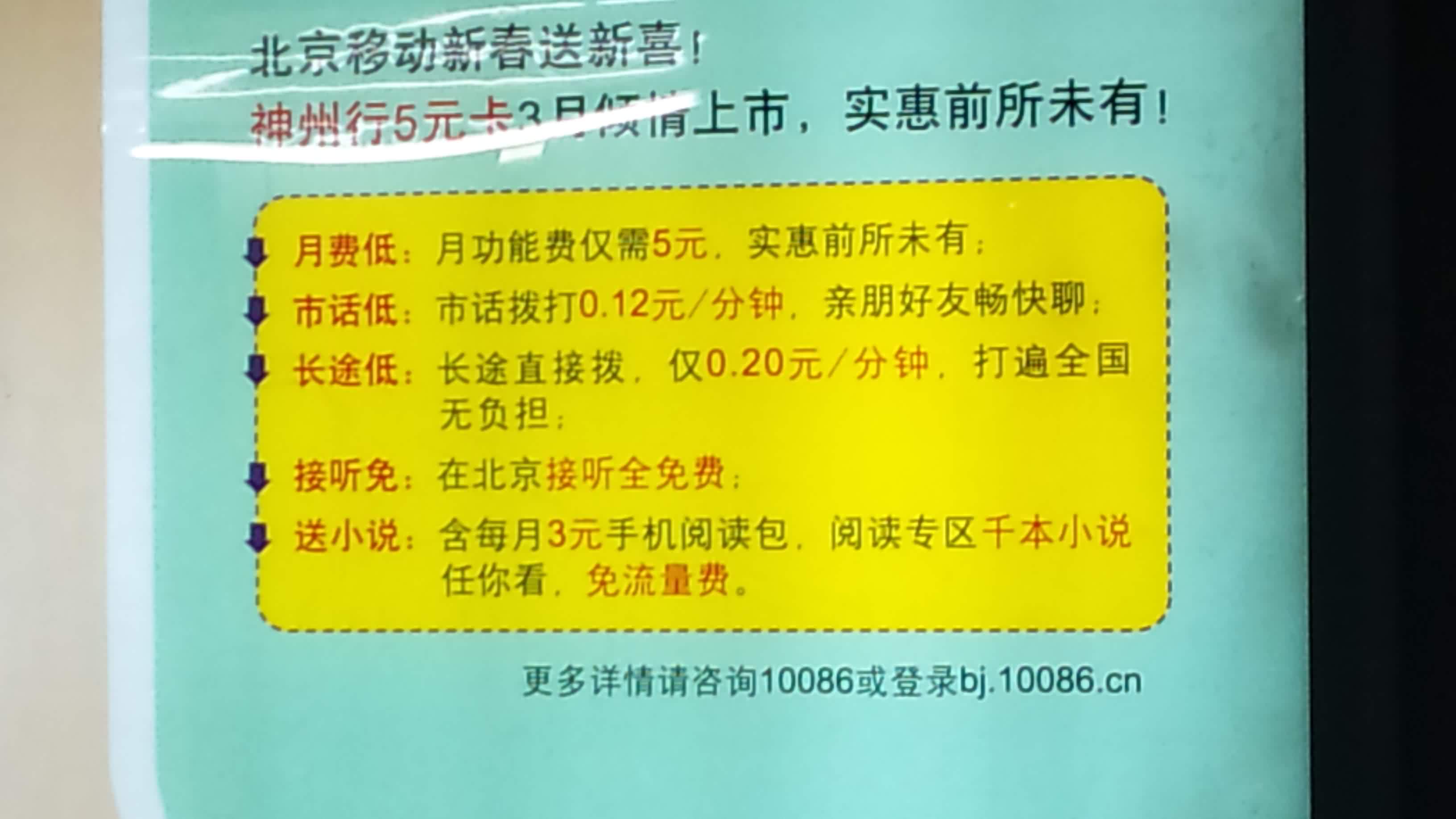 神州行5元卡北京街边广告。图片拍摄于2010年1月1日,拍摄设备为索尼爱立信X10i,这是当年在知春路上的广告,而恰恰是这个广告,让我们看到了中国移动在乱收费。