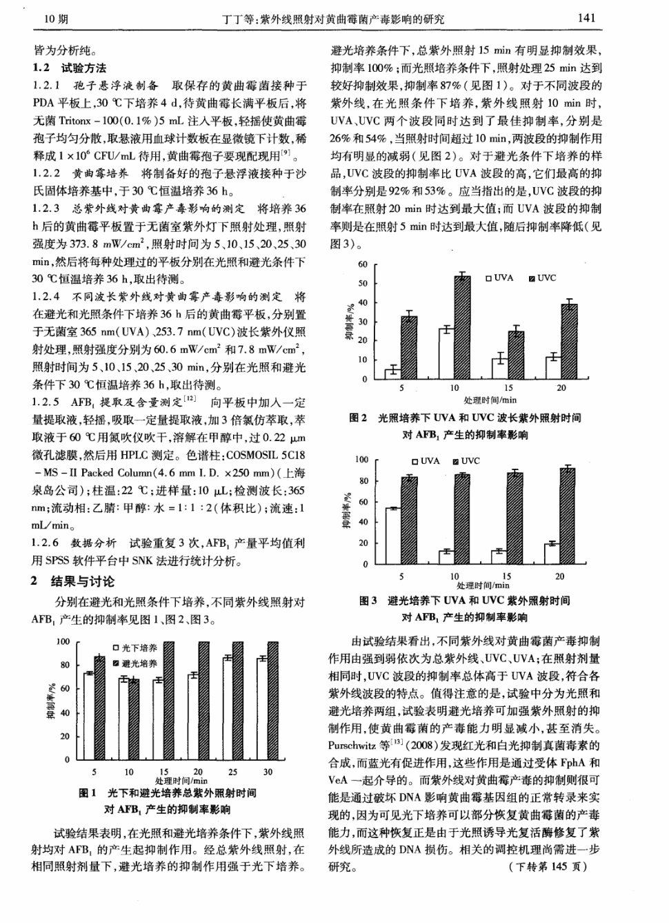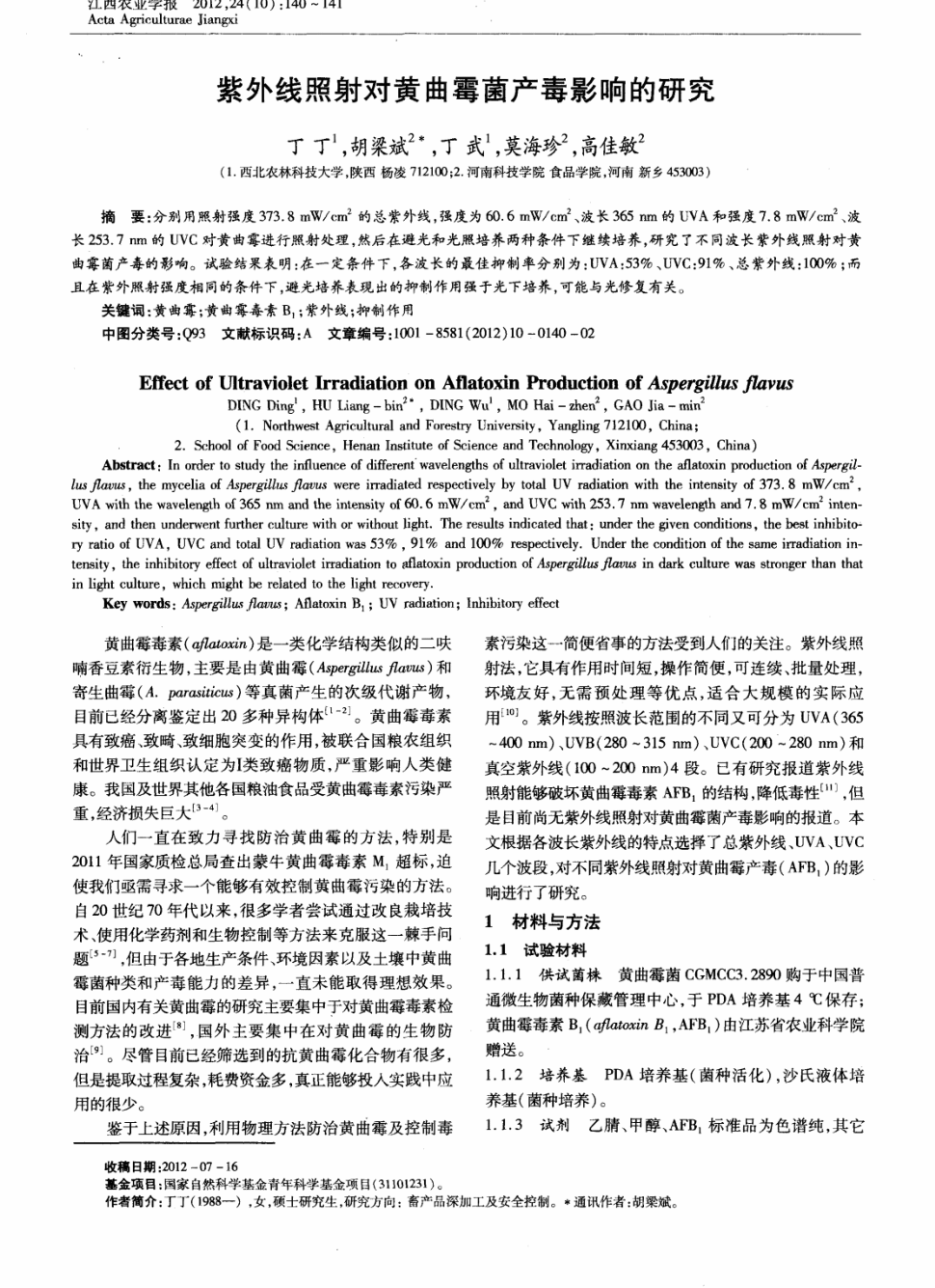 其中长波作为检测黄曲霉作用,而抑制性来看,依然是UVC 灭菌紫外线效率最高,而对于检测黄曲霉毒素的花,则应该使用具穿透效果的UVA,下面让我们看一下江西农学报2012年发表的一篇论文。紫外线照射对黄曲霉菌产毒影响的研究